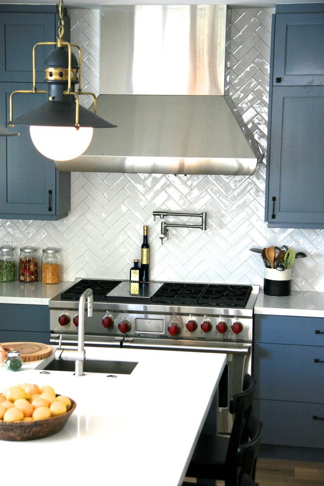оттенки синего, голубого и изумрудного — привлекут все внимание к фартуку, добавят свежести интерьеру;